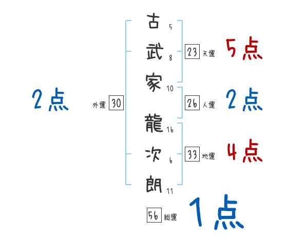 天運![]() | 古武家龍次朗さんの天運は23画の5つ星!想像力に優れ活力がある。一代で成功し名誉を手に入れる。 家系が持つ宿命的な運勢を表します。祖先から受け継いだ苗字ですので自分の力が及びません。家柄を象徴します。 |