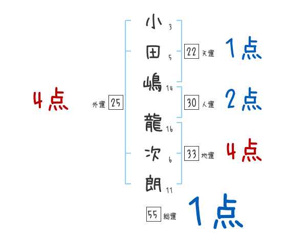 天運![]() | 小田嶋龍次朗さんの天運は22画の1つ星!努力することが苦手ないっぽう手先が器用。芸術性にも優れる。 家系が持つ宿命的な運勢を表します。祖先から受け継いだ苗字ですので自分の力が及びません。家柄を象徴します。 |
