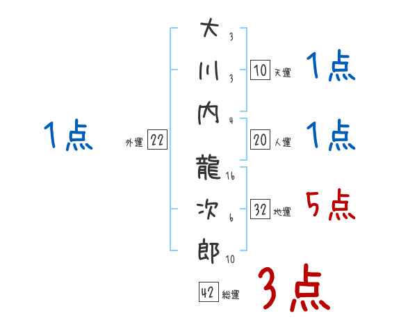 天運![]() | 大川内龍次郎さんの天運は10画の1つ星!不安を感じやすい傾向。ストレスを抱えないように注意しましょう。 家系が持つ宿命的な運勢を表します。祖先から受け継いだ苗字ですので自分の力が及びません。家柄を象徴します。 |
