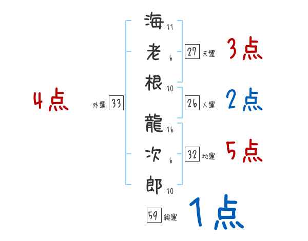 地運![]() | 海老根龍次郎さんの地運は32画の5つ星!柔軟性があり成功する。チャンスが多く金運が良い。 個性を表す基礎的な運勢です。性格形成や対人関係、行動力など家庭環境に影響されます。主に誕生してから20歳くらいまでの若年期の運勢を表します。 |