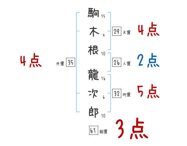 外運![]() | 駒木根龍次郎さんの外運は35画の4つ星!温厚な性格で感受性が高い。穏和な性格で人望が厚い。 生活面を象徴する運勢です。外部から受ける影響力を表し、結婚運、家庭運や職場、環境への順応性を表します。 |