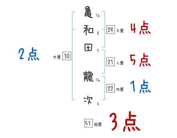 外運![]() | 亀和田龍次さんの外運は30画の2つ星!浮き沈みの激しさに注意しましょう。 生活面を象徴する運勢です。外部から受ける影響力を表し、結婚運、家庭運や職場、環境への順応性を表します。 |