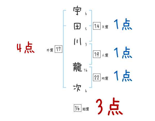 総運![]() | 宇田川龍次さんの総運は36画の3つ星!先見性が豊かです。多少神経質で苦労することも。 あなたの人生を表す1番重要な運勢です。生涯を通じて影響する総合運となり、主に50歳以降の晩年期に影響を及ぼします。 |