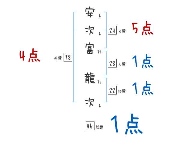 天運![]() | 安次富龍次さんの天運は24画の5つ星!家庭運が良く順調な人生。金運にも恵まれる。 家系が持つ宿命的な運勢を表します。祖先から受け継いだ苗字ですので自分の力が及びません。家柄を象徴します。 |