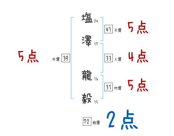 外運![]() | 塩澤龍毅さんの外運は39画の5つ星!社交性に優れ人望が厚い。人の上に立ち成功する。 生活面を象徴する運勢です。外部から受ける影響力を表し、結婚運、家庭運や職場、環境への順応性を表します。 |