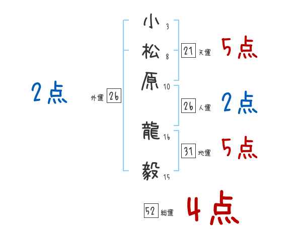 外運![]() | 小松原龍毅さんの外運は26画の2つ星!波瀾万丈かも。信頼できる人を大事にしましょう。 生活面を象徴する運勢です。外部から受ける影響力を表し、結婚運、家庭運や職場、環境への順応性を表します。 |