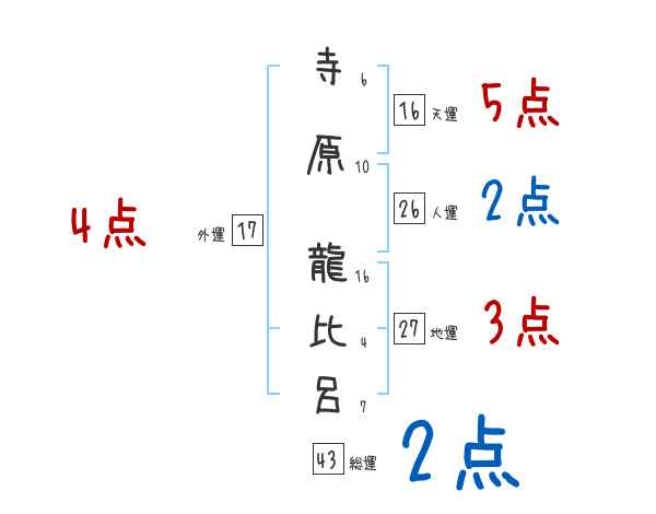 天運![]() | 寺原龍比呂さんの天運は16画の5つ星!人望が厚く大きく発展する。逆転成功が見える。 家系が持つ宿命的な運勢を表します。祖先から受け継いだ苗字ですので自分の力が及びません。家柄を象徴します。 |