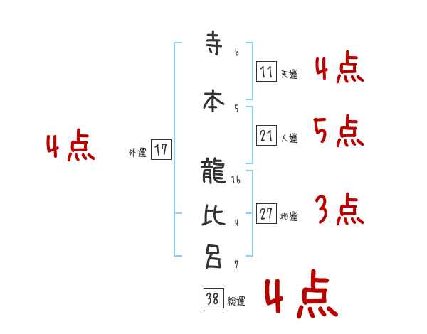 外運![]() | 寺本龍比呂さんの外運は17画の4つ星!積極的な行動力。地位を気づき財産を手に入れる。純粋な心と直感力。 生活面を象徴する運勢です。外部から受ける影響力を表し、結婚運、家庭運や職場、環境への順応性を表します。 |