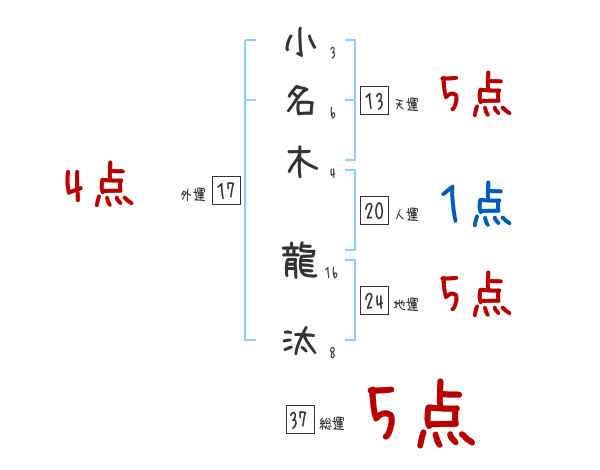 天運![]() | 小名木龍汰さんの天運は13画の5つ星!才能に恵まれ人気がある。名声を手に入れる。円満な人生。 家系が持つ宿命的な運勢を表します。祖先から受け継いだ苗字ですので自分の力が及びません。家柄を象徴します。 |