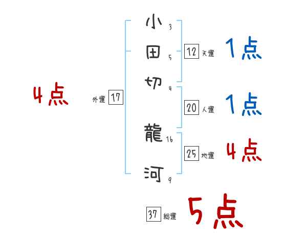 総運![]() | 小田切龍河さんの総運は37画の5つ星!努力家で順応性に優れる。現実的な考え方ができ忠実に物事をこなす。 あなたの人生を表す1番重要な運勢です。生涯を通じて影響する総合運となり、主に50歳以降の晩年期に影響を及ぼします。 |