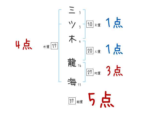 外運![]() | 三ツ木龍海さんの外運は17画の4つ星!積極的な行動力。地位を気づき財産を手に入れる。純粋な心と直感力。 生活面を象徴する運勢です。外部から受ける影響力を表し、結婚運、家庭運や職場、環境への順応性を表します。 |