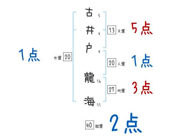 天運![]() | 古井戸龍海さんの天運は13画の5つ星!才能に恵まれ人気がある。名声を手に入れる。円満な人生。 家系が持つ宿命的な運勢を表します。祖先から受け継いだ苗字ですので自分の力が及びません。家柄を象徴します。 |