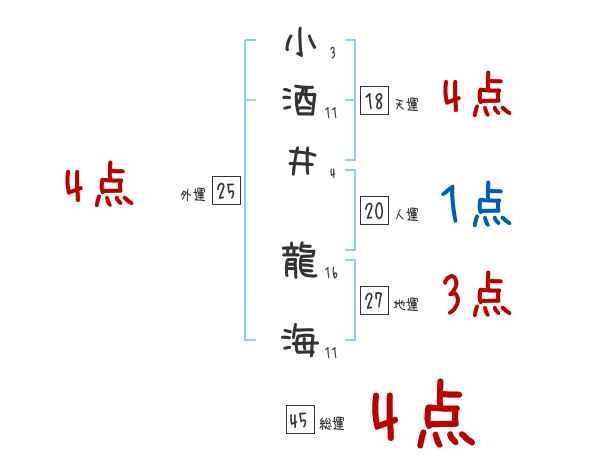 天運![]() | 小酒井龍海さんの天運は18画の4つ星!情熱的で剛気。忍耐力があり信頼される。 家系が持つ宿命的な運勢を表します。祖先から受け継いだ苗字ですので自分の力が及びません。家柄を象徴します。 |