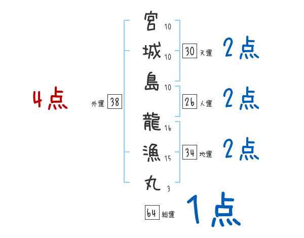 天運![]() | 宮城島龍漁丸さんの天運は30画の2つ星!浮き沈みの激しさに注意しましょう。 家系が持つ宿命的な運勢を表します。祖先から受け継いだ苗字ですので自分の力が及びません。家柄を象徴します。 |