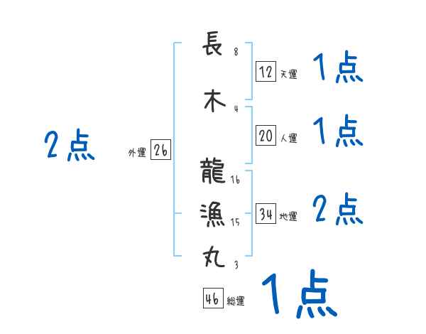 天運![]() | 長木龍漁丸さんの天運は12画の1つ星!簡単な失敗で諦めてしまいやすいかも。着実に行動すると良いでしょう。 家系が持つ宿命的な運勢を表します。祖先から受け継いだ苗字ですので自分の力が及びません。家柄を象徴します。 |