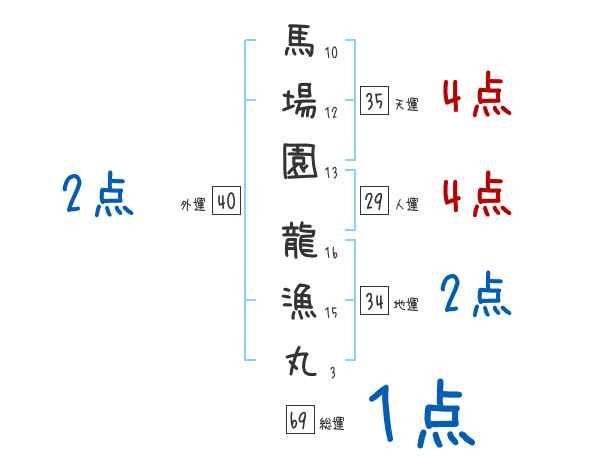 天運![]() | 馬場園龍漁丸さんの天運は35画の4つ星!温厚な性格で感受性が高い。穏和な性格で人望が厚い。 家系が持つ宿命的な運勢を表します。祖先から受け継いだ苗字ですので自分の力が及びません。家柄を象徴します。 |