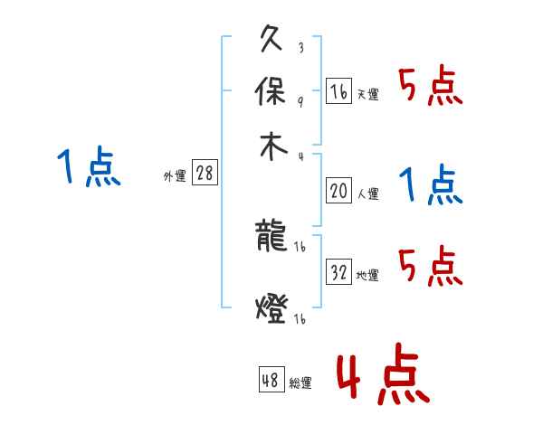 外運![]() | 久保木龍燈さんの外運は28画の1つ星!家庭環境に注意。スポーツで活躍できる能力があるかも。 生活面を象徴する運勢です。外部から受ける影響力を表し、結婚運、家庭運や職場、環境への順応性を表します。 |