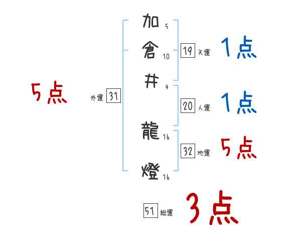 総運![]() | 加倉井龍燈さんの総運は51画の3つ星!変化が激しく、危険に注意。堅実な性格。 あなたの人生を表す1番重要な運勢です。生涯を通じて影響する総合運となり、主に50歳以降の晩年期に影響を及ぼします。 |