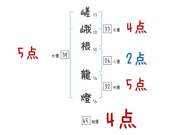 外運![]() | 嵯峨根龍燈さんの外運は39画の5つ星!社交性に優れ人望が厚い。人の上に立ち成功する。 生活面を象徴する運勢です。外部から受ける影響力を表し、結婚運、家庭運や職場、環境への順応性を表します。 |