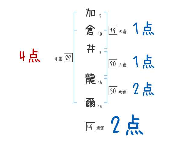 総運![]() | 加倉井龍爾さんの総運は49画の2つ星!不安定な性格で明暗がある人生。周りの人には支援されやすい。 あなたの人生を表す1番重要な運勢です。生涯を通じて影響する総合運となり、主に50歳以降の晩年期に影響を及ぼします。 |