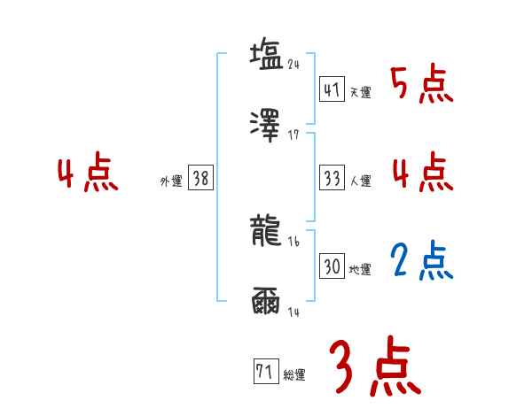 天運![]() | 塩澤龍爾さんの天運は41画の5つ星!大志を抱き、目標に向かって実力を発揮し達成する。温和な性格。 家系が持つ宿命的な運勢を表します。祖先から受け継いだ苗字ですので自分の力が及びません。家柄を象徴します。 |