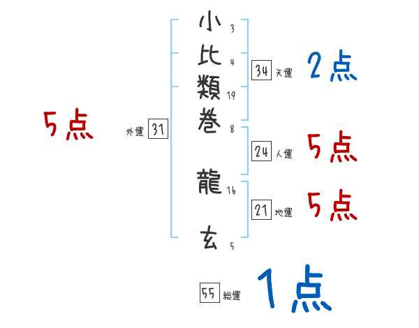 天運![]() | 小比類巻龍玄さんの天運は34画の2つ星!独創性に優れるが、自尊心が強く災難に注意しましょう。 家系が持つ宿命的な運勢を表します。祖先から受け継いだ苗字ですので自分の力が及びません。家柄を象徴します。 |
