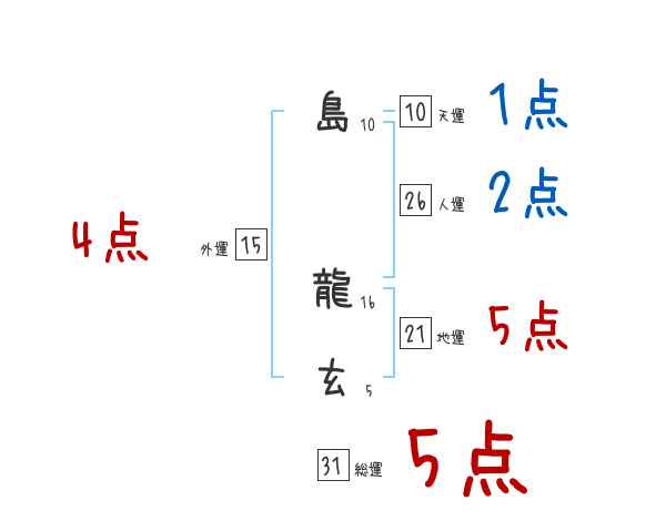 天運![]() | 島龍玄さんの天運は10画の1つ星!不安を感じやすい傾向。ストレスを抱えないように注意しましょう。 家系が持つ宿命的な運勢を表します。祖先から受け継いだ苗字ですので自分の力が及びません。家柄を象徴します。 |