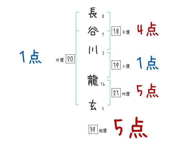 天運![]() | 長谷川龍玄さんの天運は18画の4つ星!情熱的で剛気。忍耐力があり信頼される。 家系が持つ宿命的な運勢を表します。祖先から受け継いだ苗字ですので自分の力が及びません。家柄を象徴します。 |