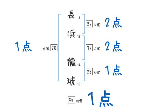 天運![]()  | 長浜龍琥さんの天運は26画の2つ星!波瀾万丈かも。信頼できる人を大事にしましょう。 家系が持つ宿命的な運勢を表します。祖先から受け継いだ苗字ですので自分の力が及びません。家柄を象徴します。 |