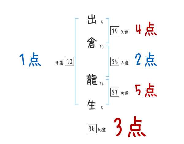 総運![]() | 出倉龍生さんの総運は36画の3つ星!先見性が豊かです。多少神経質で苦労することも。 あなたの人生を表す1番重要な運勢です。生涯を通じて影響する総合運となり、主に50歳以降の晩年期に影響を及ぼします。 |