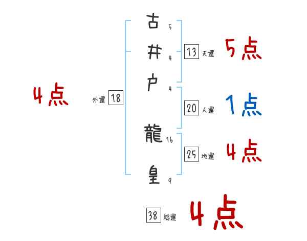 天運![]() | 古井戸龍皇さんの天運は13画の5つ星!才能に恵まれ人気がある。名声を手に入れる。円満な人生。 家系が持つ宿命的な運勢を表します。祖先から受け継いだ苗字ですので自分の力が及びません。家柄を象徴します。 |