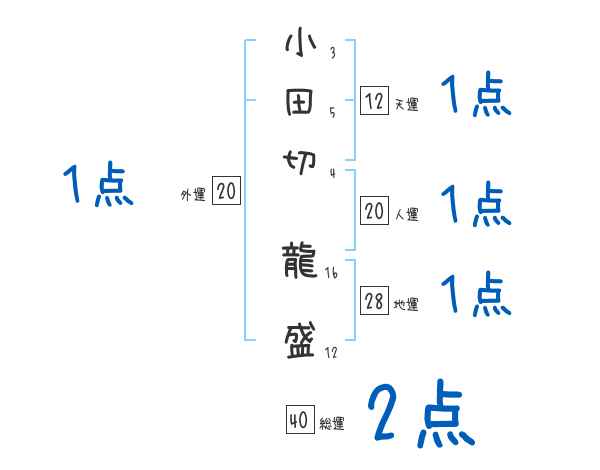 天運![]() | 小田切龍盛さんの天運は12画の1つ星!簡単な失敗で諦めてしまいやすいかも。着実に行動すると良いでしょう。 家系が持つ宿命的な運勢を表します。祖先から受け継いだ苗字ですので自分の力が及びません。家柄を象徴します。 |