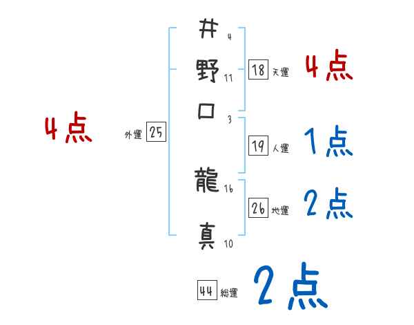 天運![]() | 井野口龍真さんの天運は18画の4つ星!情熱的で剛気。忍耐力があり信頼される。 家系が持つ宿命的な運勢を表します。祖先から受け継いだ苗字ですので自分の力が及びません。家柄を象徴します。 |