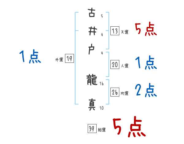 総運![]() | 古井戸龍真さんの総運は39画の5つ星!社交性に優れ人望が厚い。人の上に立ち成功する。 あなたの人生を表す1番重要な運勢です。生涯を通じて影響する総合運となり、主に50歳以降の晩年期に影響を及ぼします。 |