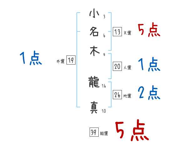 総運![]() | 小名木龍真さんの総運は39画の5つ星!社交性に優れ人望が厚い。人の上に立ち成功する。 あなたの人生を表す1番重要な運勢です。生涯を通じて影響する総合運となり、主に50歳以降の晩年期に影響を及ぼします。 |