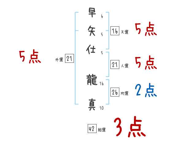 天運![]() | 早矢仕龍真さんの天運は16画の5つ星!人望が厚く大きく発展する。逆転成功が見える。 家系が持つ宿命的な運勢を表します。祖先から受け継いだ苗字ですので自分の力が及びません。家柄を象徴します。 |