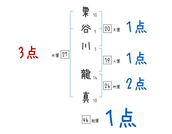 総運![]() | 栗谷川龍真さんの総運は46画の1つ星!迷走することが多く苦労するかも。目先のことにとらわれないように。 あなたの人生を表す1番重要な運勢です。生涯を通じて影響する総合運となり、主に50歳以降の晩年期に影響を及ぼします。 |