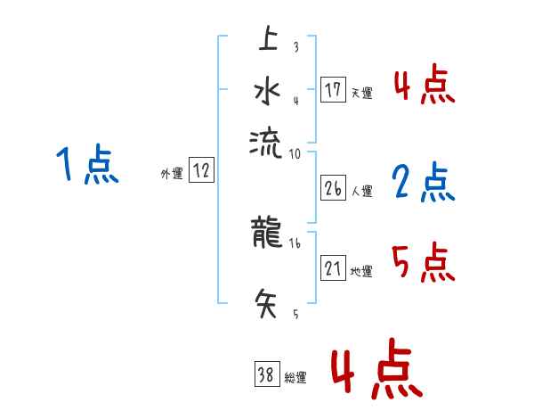 天運![]() | 上水流龍矢さんの天運は17画の4つ星!積極的な行動力。地位を気づき財産を手に入れる。純粋な心と直感力。 家系が持つ宿命的な運勢を表します。祖先から受け継いだ苗字ですので自分の力が及びません。家柄を象徴します。 |