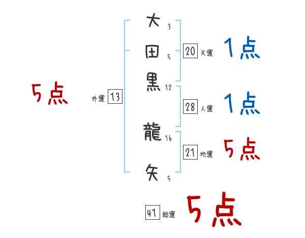 人運![]() | 大田黒龍矢さんの人運は28画の1つ星!家庭環境に注意。スポーツで活躍できる能力があるかも。 性格や才能などを表す2番目に重要な運勢です。人間関係や協調性、社会的な成功に影響します。主に20歳から50歳ぐらいまでの中年期の運勢を表します。 |