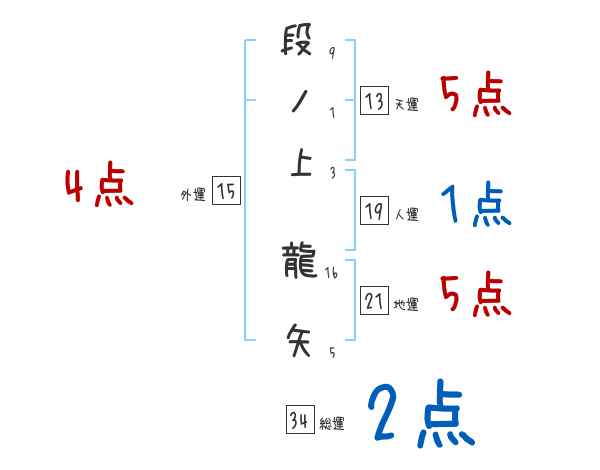 天運![]() | 段ノ上龍矢さんの天運は13画の5つ星!才能に恵まれ人気がある。名声を手に入れる。円満な人生。 家系が持つ宿命的な運勢を表します。祖先から受け継いだ苗字ですので自分の力が及びません。家柄を象徴します。 |
