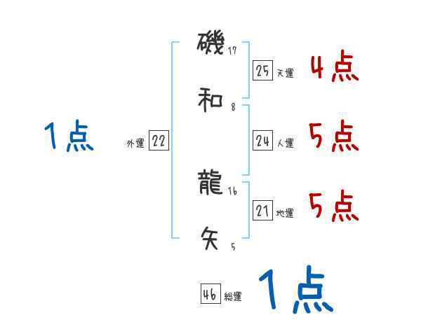 天運![]() | 磯和龍矢さんの天運は25画の4つ星!個性があり才能があふれる。強運の持ち主で発展する。 家系が持つ宿命的な運勢を表します。祖先から受け継いだ苗字ですので自分の力が及びません。家柄を象徴します。 |