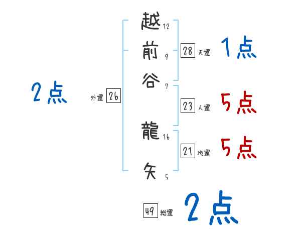天運![]() | 越前谷龍矢さんの天運は28画の1つ星!家庭環境に注意。スポーツで活躍できる能力があるかも。 家系が持つ宿命的な運勢を表します。祖先から受け継いだ苗字ですので自分の力が及びません。家柄を象徴します。 |