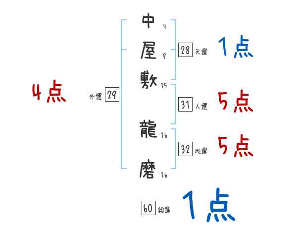 地運![]() | 中屋敷龍磨さんの地運は32画の5つ星!柔軟性があり成功する。チャンスが多く金運が良い。 個性を表す基礎的な運勢です。性格形成や対人関係、行動力など家庭環境に影響されます。主に誕生してから20歳くらいまでの若年期の運勢を表します。 |