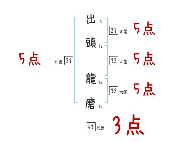 天運![]() | 出頭龍磨さんの天運は21画の5つ星!統率力がある。独立し成功する。名誉を手に入れる。 家系が持つ宿命的な運勢を表します。祖先から受け継いだ苗字ですので自分の力が及びません。家柄を象徴します。 |