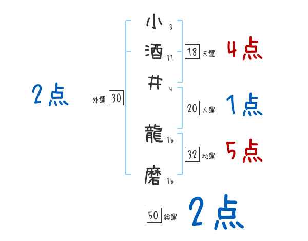 天運![]() | 小酒井龍磨さんの天運は18画の4つ星!情熱的で剛気。忍耐力があり信頼される。 家系が持つ宿命的な運勢を表します。祖先から受け継いだ苗字ですので自分の力が及びません。家柄を象徴します。 |