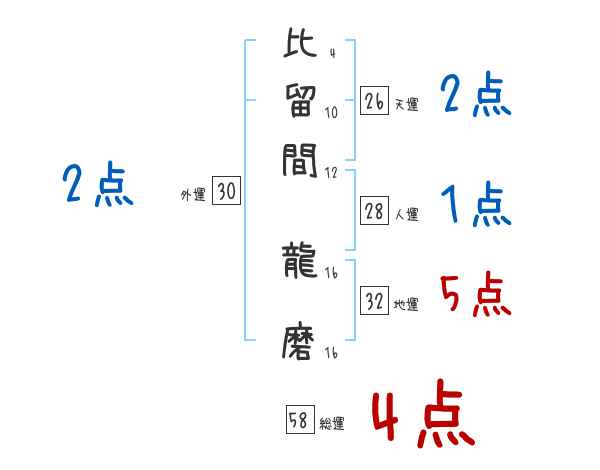 | 天運  | 比留間龍磨さんの天運は26画の2つ星!波瀾万丈かも。信頼できる人を大事にしましょう。家系が持つ宿命的な運勢を表します。祖先から受け継いだ苗字ですので自分の力が及びません。家柄を象徴します。 |
