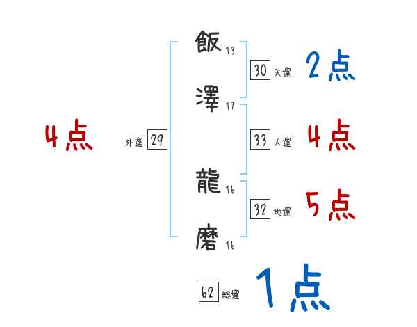 天運![]() | 飯澤龍磨さんの天運は30画の2つ星!浮き沈みの激しさに注意しましょう。 家系が持つ宿命的な運勢を表します。祖先から受け継いだ苗字ですので自分の力が及びません。家柄を象徴します。 |