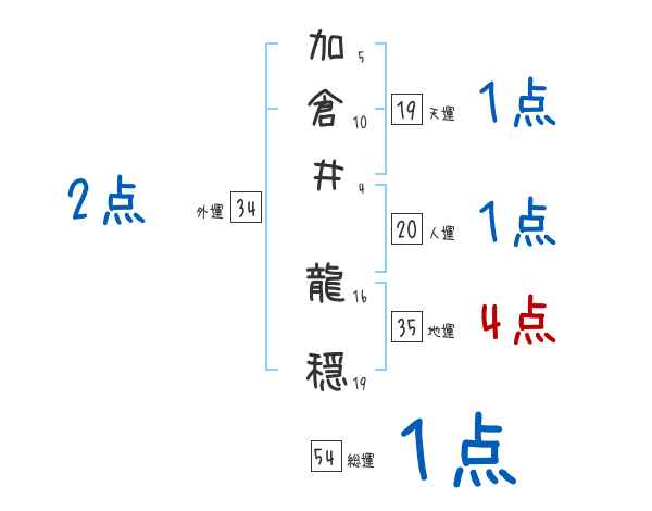 外運![]() | 加倉井龍穏さんの外運は34画の2つ星!独創性に優れるが、自尊心が強く災難に注意しましょう。 生活面を象徴する運勢です。外部から受ける影響力を表し、結婚運、家庭運や職場、環境への順応性を表します。 |