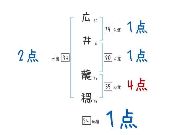 天運![]() | 広井龍穏さんの天運は19画の1つ星!優れた才能を持ちますが、協調性が足りないことも。周りの人と協力する事を意識しましょう。 家系が持つ宿命的な運勢を表します。祖先から受け継いだ苗字ですので自分の力が及びません。家柄を象徴します。 |