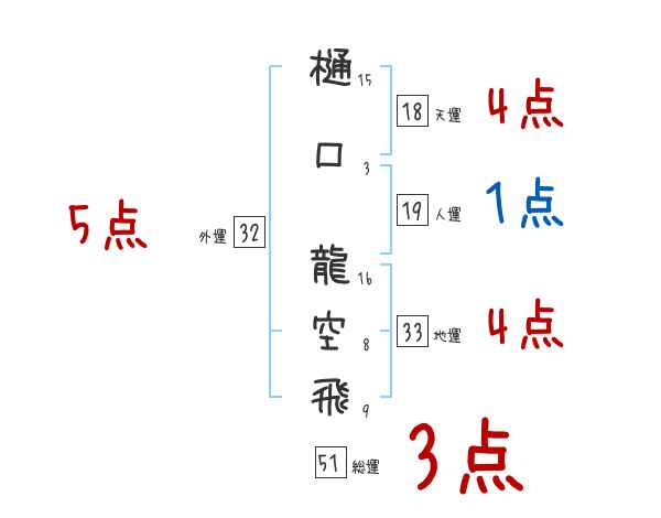 天運![]() | 樋口龍空飛さんの天運は18画の4つ星!情熱的で剛気。忍耐力があり信頼される。 家系が持つ宿命的な運勢を表します。祖先から受け継いだ苗字ですので自分の力が及びません。家柄を象徴します。 |